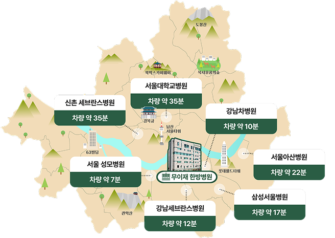 본원치료 편리하고 편안하게 주요 대형 병원· 대형 암센터와 약 20분 이내로 위치해 있습니다.